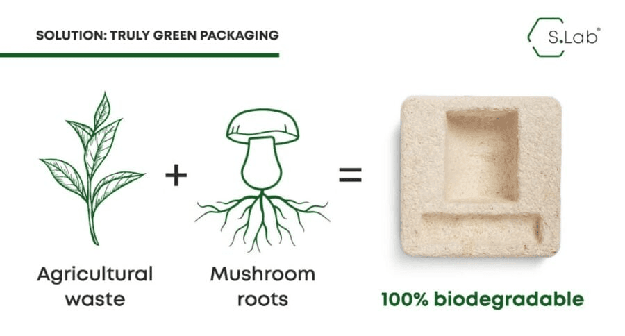 By harvesting the strength of agricultural waste and the binding power of mycelium, S.Lab creates a strong and reliable alternative to foamed plastic packaging.